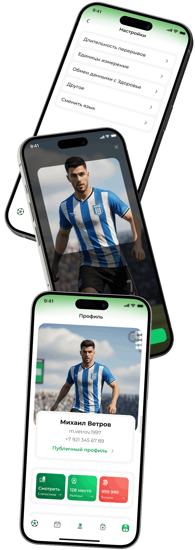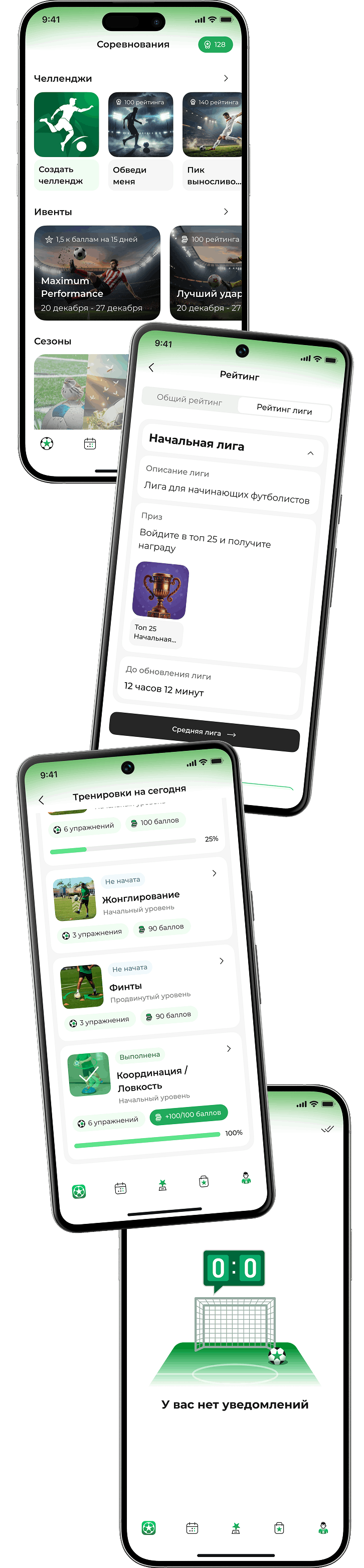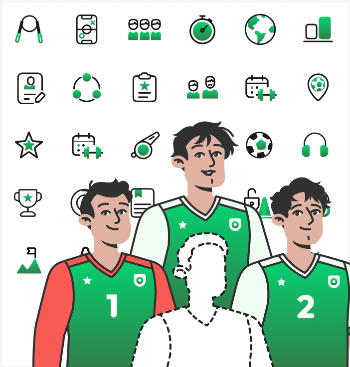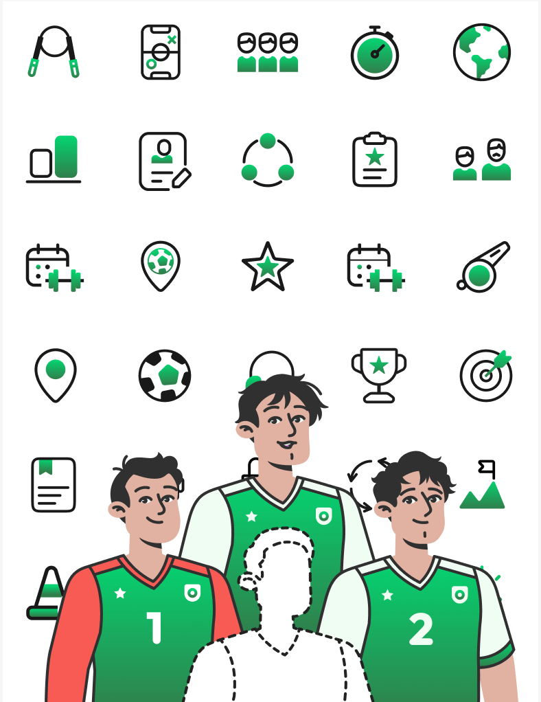 Для разных состояний экранов и слайдов онбординга мы создали иллюстрации. Также отрисовали сет иконок, наша особенная гордость — максимально детализированная иконка футбольного поля
