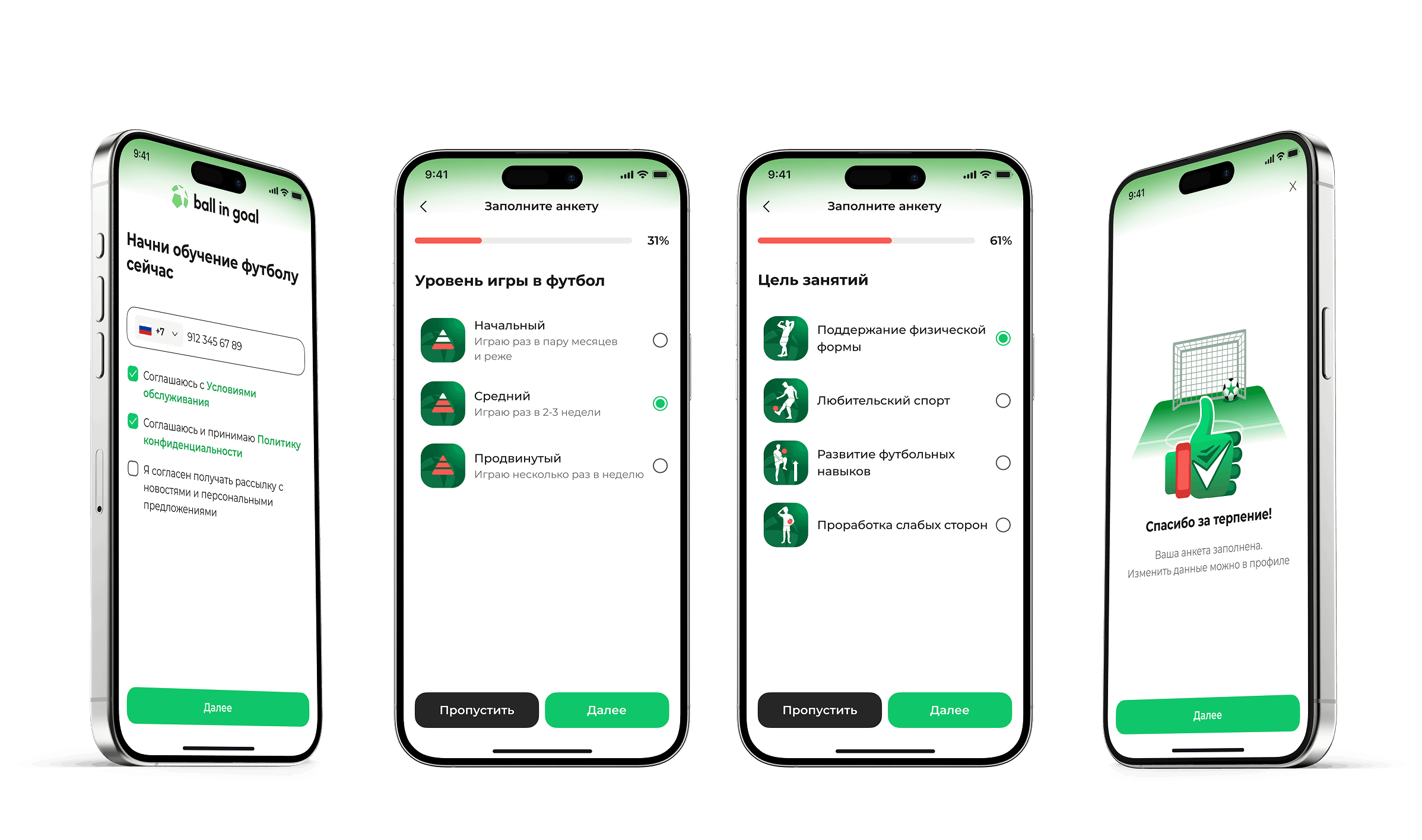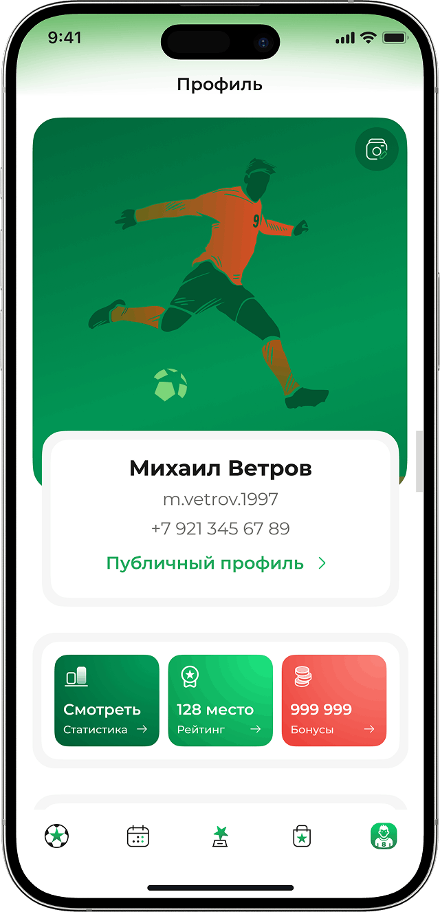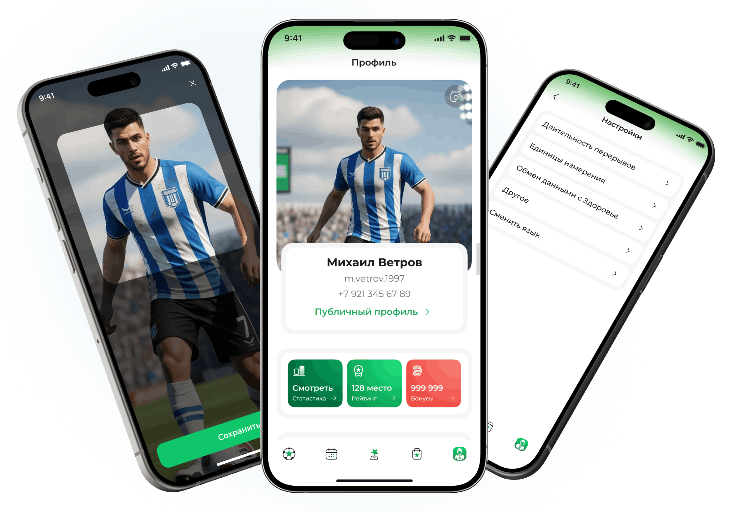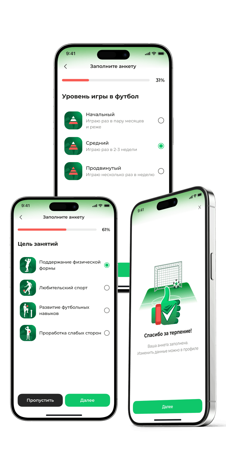 Для разных состояний экранов и слайдов онбординга мы создали иллюстрации. Также отрисовали сет иконок, наша особенная гордость — максимально детализированная иконка футбольного поля