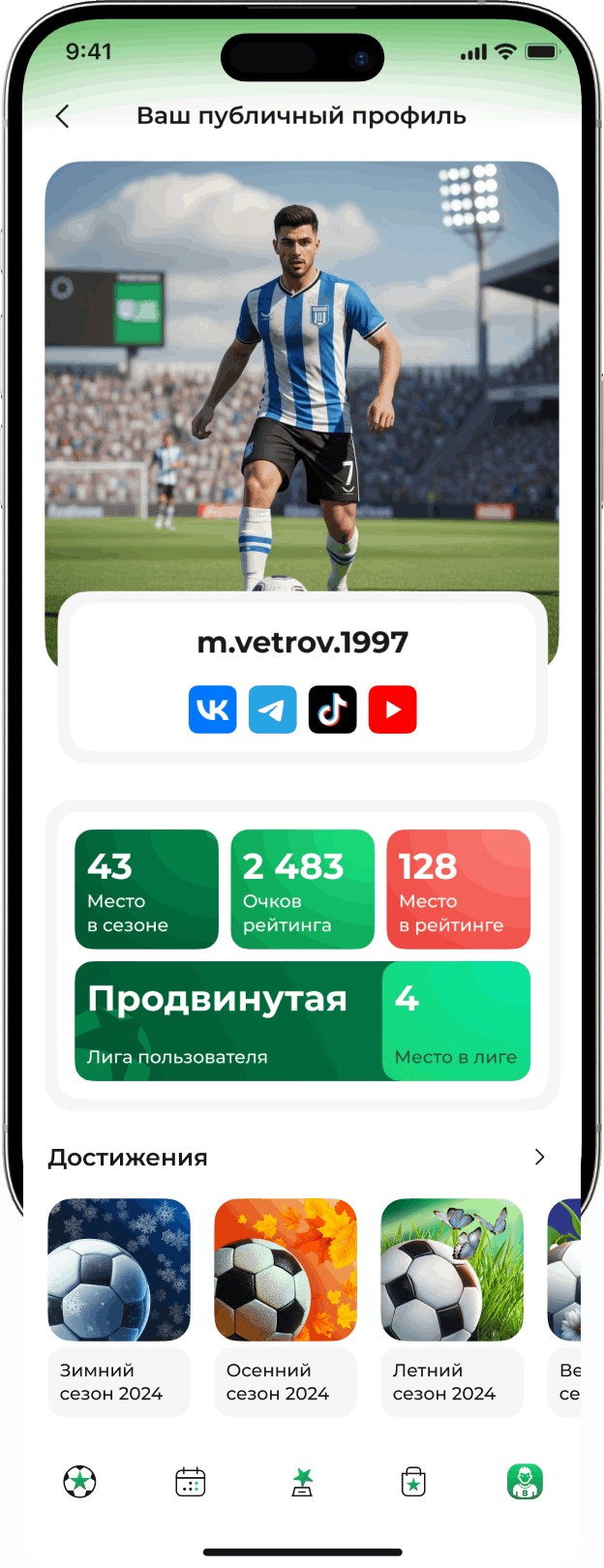 Место в сезоне и общем рейтинге, очки, принадлежность к лиге и место в ней, список достижений в челленджах и других событиях