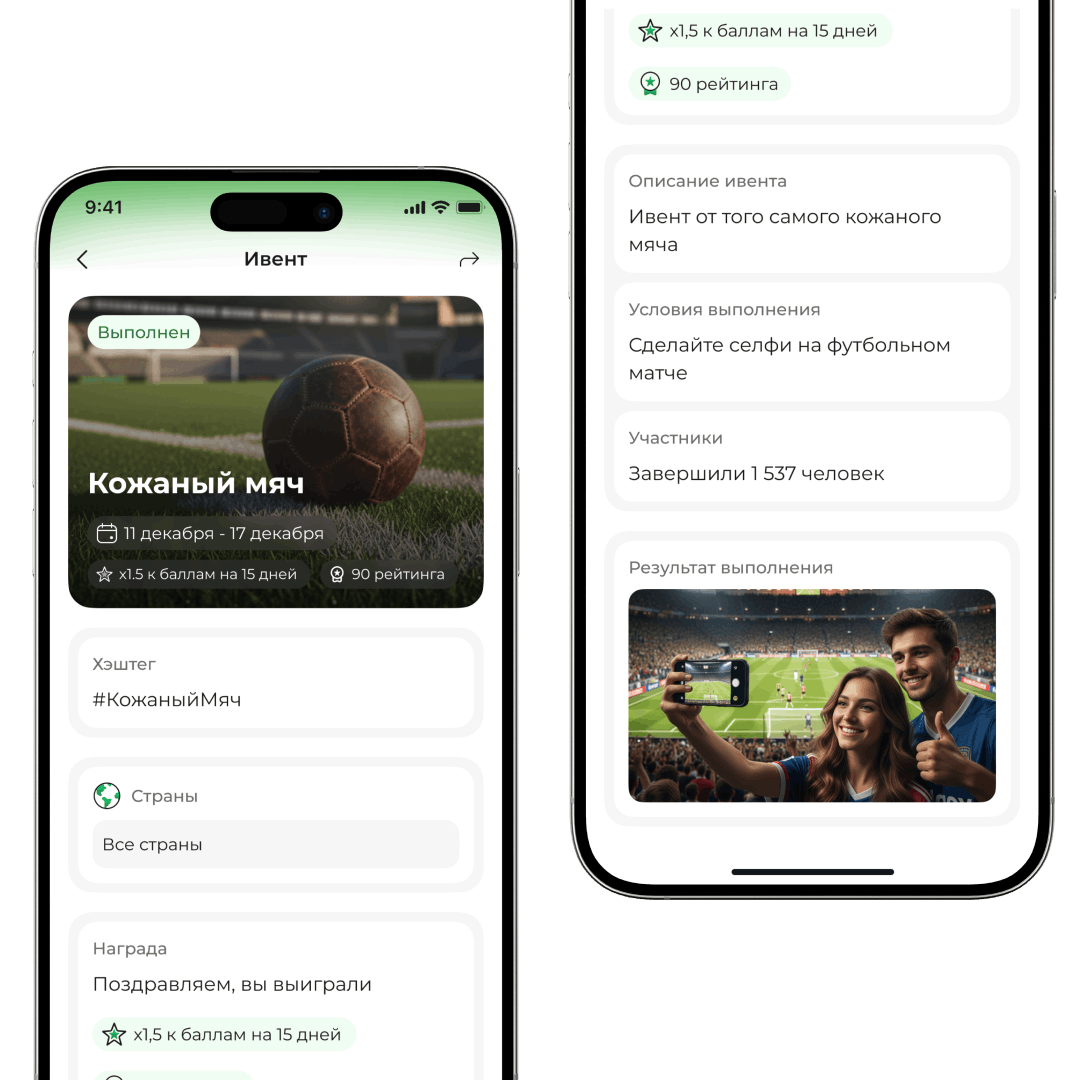 - Участники ивента выполняют задания. Обычно это небольшие задания, например, «Посетите футбольный матч. Подтвердите геопозицию во время матча» или «Сделайте селфи на футбольном матче»