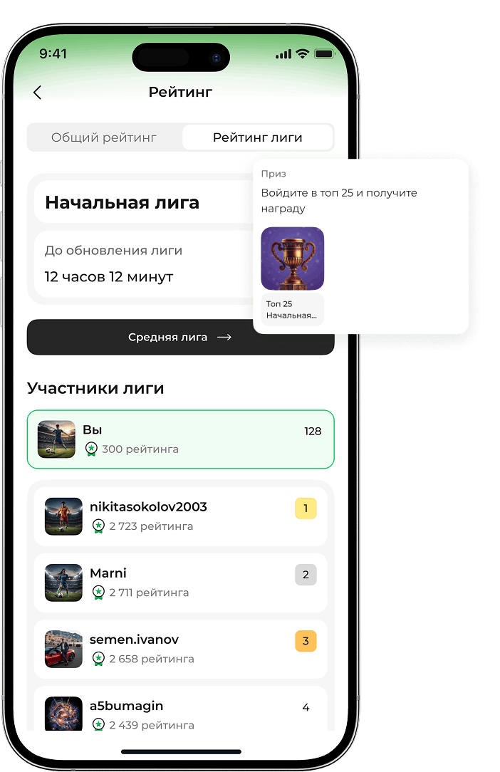 В приложении есть три лиги, рассчитанные под разные уровни игроков: «Начальная», «Средняя», «Высшая». В каждой лиге — свой рейтинг