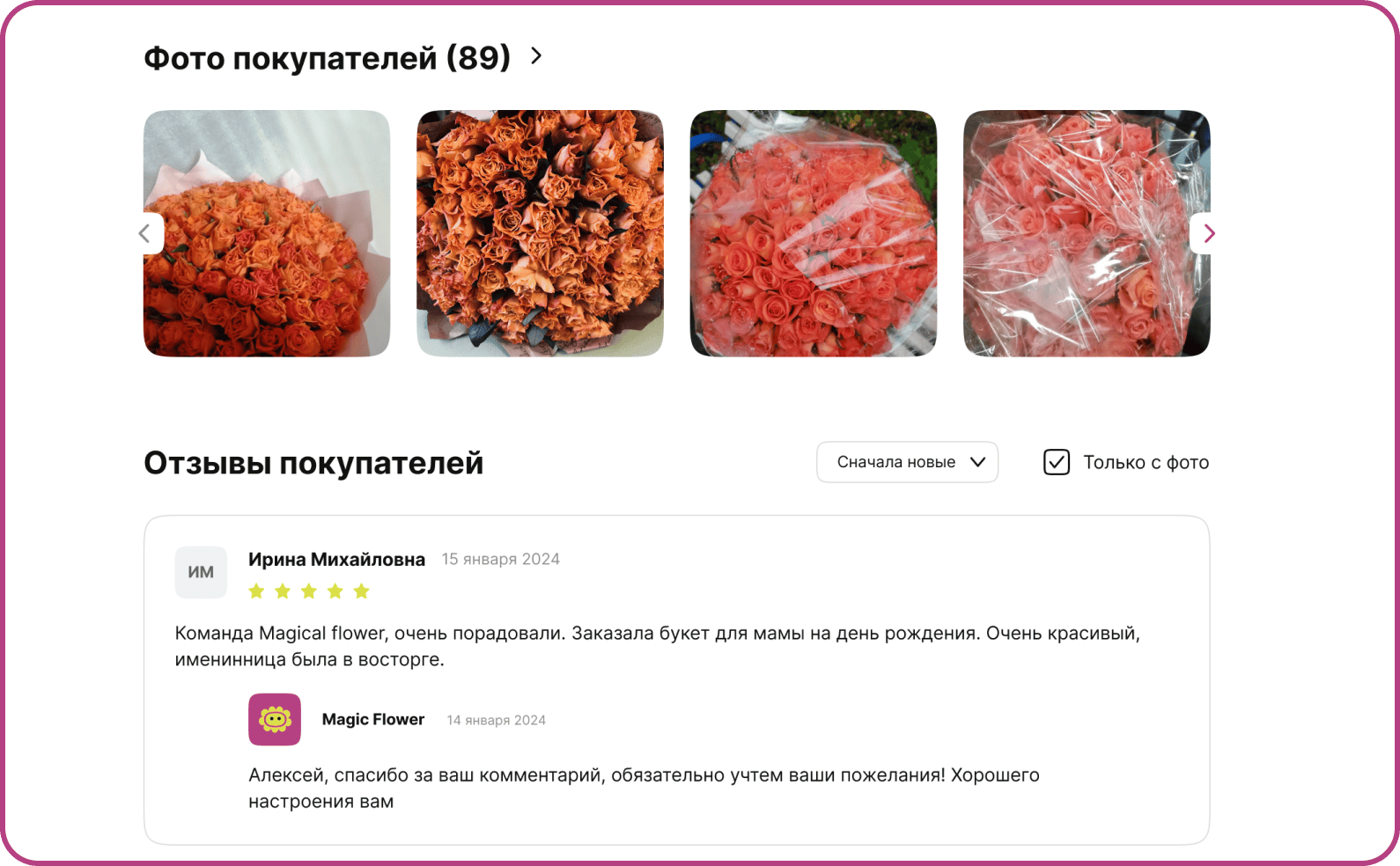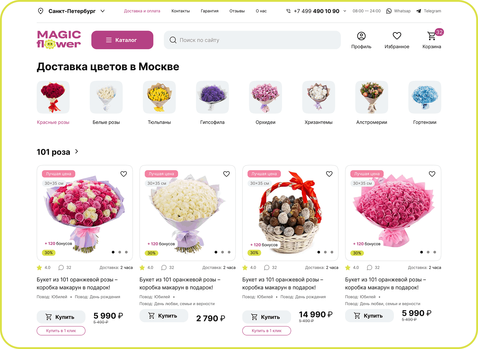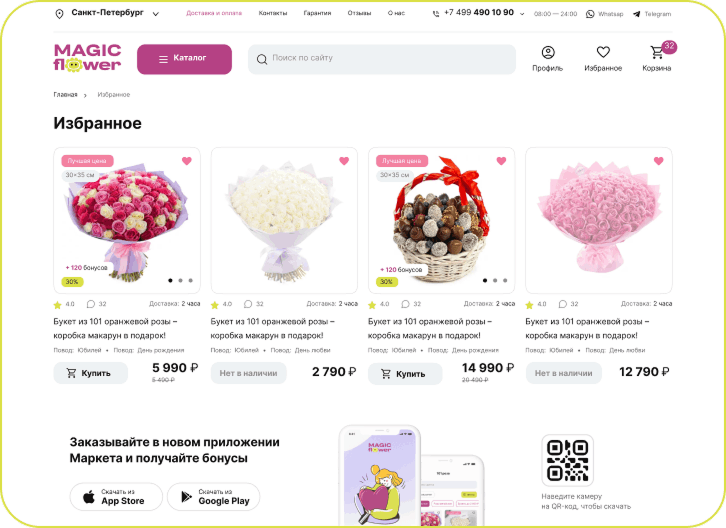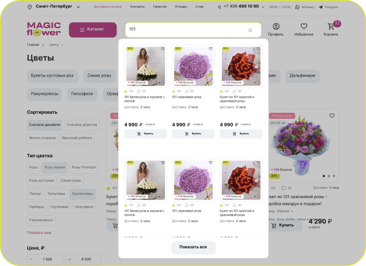 Устроили её по принципу страницы маркетплейса, чтобы стимулировать продажи. Например, если покупатель нажимает на цвет «белый», сайт показывает ему один из букетов из белых цветов, заранее созданных заказчиком в административной панели сайта.