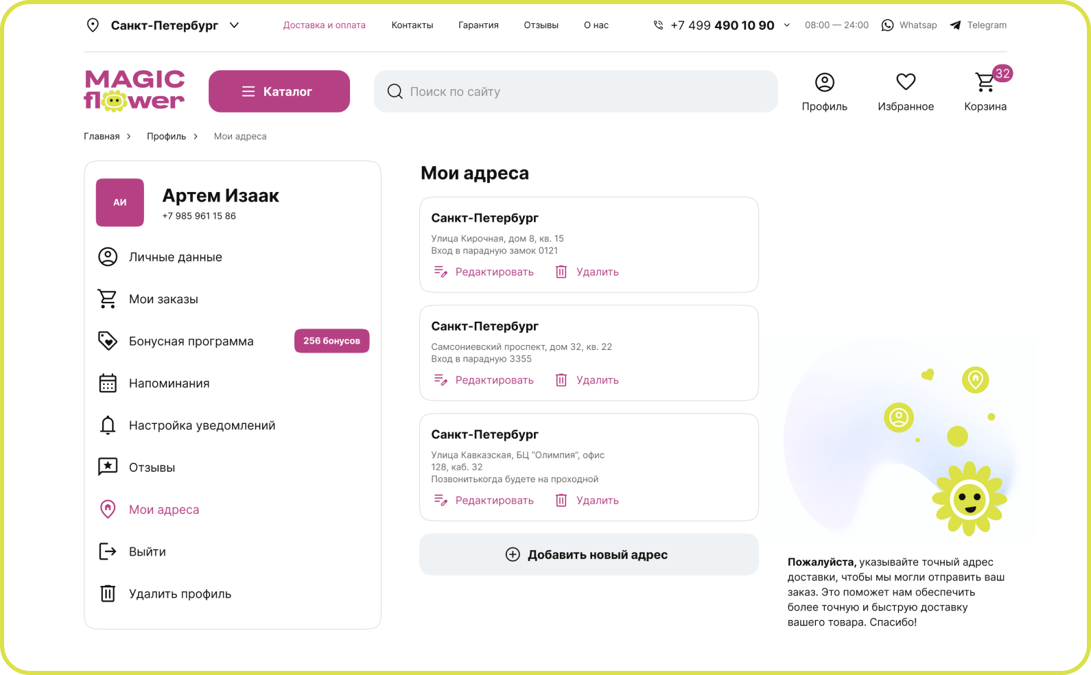- Адрес: возможность добавить новый или выбрать уже добавленный